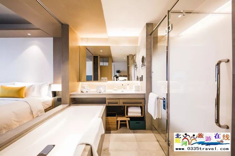 衛(wèi)生間采用干濕分離,有獨(dú)立科勒浴缸,獨(dú)立衛(wèi)生間和獨(dú)立淋浴房。使用浴缸時(shí)可以拉上和床鋪間的折疊門保證私密性。